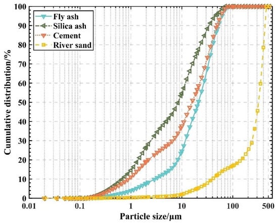 The cement was P-O 42.5R cement; the fly ash was grade I ultrafine fly ash produced by Henan Rongchangsheng Water Purification Material Factory; the fine aggregate was natural river sand sieved through a 0.5 mm mesh, with an average particle size of 322 µm and an apparent density of 2.65 g/cm3; and the silica fume was provided by Henan Hengwang Chemical Building Materials Co. The particle size distribution curve of the above materials is shown in Figure 1. The glass type is tempered flat glass, which comes from a waste collection station; the superplasticizer is Shanghai Qinhe polycarboxylic superplasticizer, with a water-reducing rate of 23%. The chemical components of the cementitious materials are shown in Table 1.