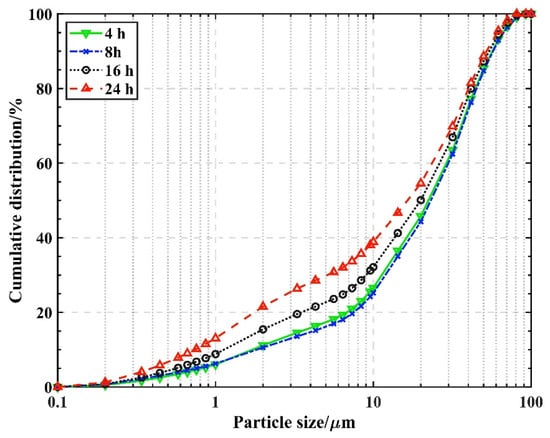 Particle size distribution of glass powder with different grinding times.