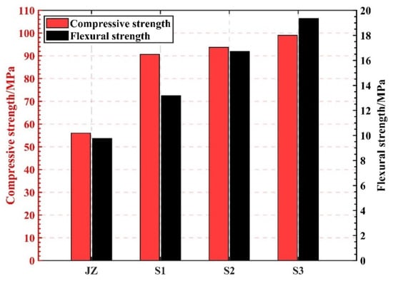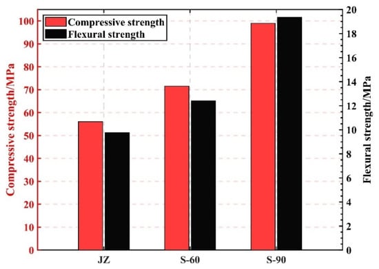 The surface of the molded specimen was covered with a layer of plastic film and numbered, put into a standard concrete curing box for 24 h, and then demolded and moved into a rapid concrete curing box. The specimens were then subjected to steam curing at 90 °C for 72 h. After removal, the specimens were transferred to a standard concrete curing box to continue curing until the age of the specimens was 7 d. Finally, once the specimens had reached the age for flexural and compressive strength testing according to GB/T 17671-1999 [], they were tested.