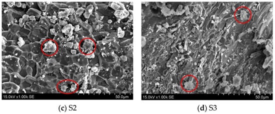The SEM pictures of every specimen after 7 days at varying steam curing durations are displayed in Figure 7. Visible cracks in normal cementitious material are indicated by yellow circles. The microstructure of GHSC is more dense compared to that of normal cementitious material. It is difficult to see hexagonal plate-like Ca(OH)2 crystals and needle-like calcite crystals; this is compatible with the test results of XRD. Each specimen’s fly ash is indicated in red in the SEM pictures. Fly ash occurs in relatively regular spherical beads, the composition of most of which does not differ much from the spherical glass particles []. Figure 7a shows that the specimen’s hydration products are looser, that there are tiny fractures between the particles, and that there is currently a small number of hydration products on the fly ash particles’ surface. Following that, as the steam conditioning time of the specimens was extended, Figure 7b–d show a gradual increase in the hydration products on the fly ash particles’ inside surface as well as clear indentations. These findings suggest that the fly ash’s activity was enhanced by the extended high-temperature steam conditioning time. In conclusion, when paired with Figure 7a, it becomes evident that each specimen’s microstructure becomes more compact as steam-conditioning time is extended, and the specimen’s microstructure gradually becomes more dense as opposed to initially being loose, indicating that the hydration products become regular and orderly. The macroscale increase in compressive and flexural strength indicates the improvement of the microstructure, which is consistent with the findings of the study conducted by Liu et al. [].
