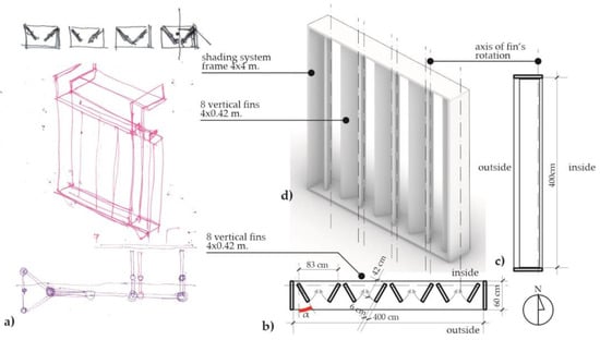 Shading system proposal: (a) the stages of the ideation of the shading system, sketches and the perspective drawings; final dimensions of the proposed shading system; (b) horizontal section; (c) vertical section; (d) axonometric view. Angle α (marked in red) is the vertical fin rotation angle.