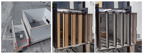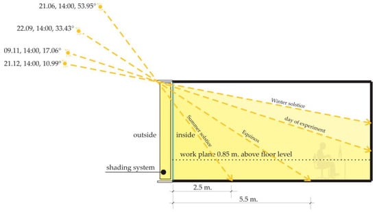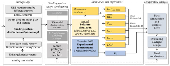 The author conducted two types of analysis of the proposed shading system: (i) first stage—an annual UDI300–3000 and glare simulation, using standardized weather data for the given location obtained from EnergyPlus’s database, using different geometry of the shading system in different scenarios (variants); (ii) second stage—an experimental measurement of illuminance on selected clear days in November 2023, using a south-oriented, reduced-scale prototype of the facade installed on the testbed specifically constructed for measuring daylight. Figure 3 presents the schematic diagram of the methodology, and the author gives a detailed explanation in the respective chapters.