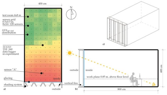 - A computer model of the facade that was prepared and tested in different scenarios by determining the annual illuminance on the work plane, 0.85 m above the floor level. The method uses the simulation performed by the Radiance engine. In addition, the method includes different kinetic scenarios for the vertical fins that rotate (close and open) according to the illuminance level at the work plane in the office room. UDI was used successfully in a previous paper to measure the daylight level [41];