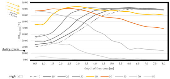 This paper’s primary goal is to determine the highest level of useful daylight illuminance (UDI300–3000) that can be achieved using mixed settings of the shading system elements. Additional objectives of this study are to simulate the qualitative metrics, luminance level and daylight glare probability (DGP) and to identify the optimal daylighting scenario to maximize UDI300–3000.