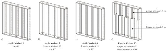 The author chose vertical fins for the kinetic facade system for two reasons: (i) to avoid snow accumulation, which was a significant concern due to the local climate and (ii) to provide a view outside for the workers in the room, even with the large angle of the fin’s vertical rotation. The author knows about the research findings indicating vertical fins’ lower effectiveness for south-facing facades [8]. However, snow could pose an additional load and blockage threat to the shading system. Climate change and the rise in average temperatures have affected Wrocław, too. Still, this change has had a limited impact on the snow cover, which has varied considerably since 2000, with some seasons (e.g., 2009/2010) having an average snow depth of 9.8 cm and snow lasting for 107 days [40].