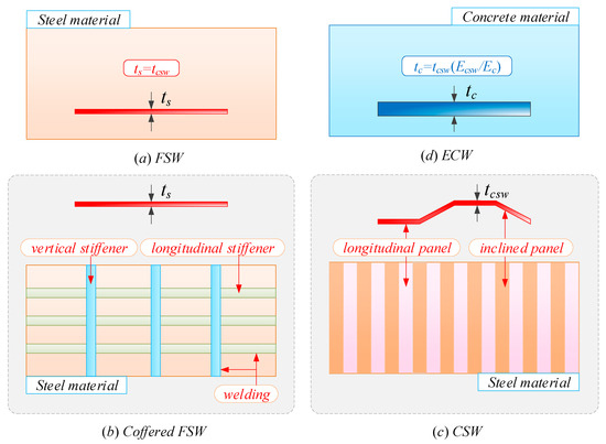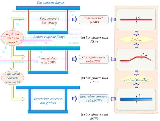 Based on the principle of equivalent stiffness, equivalent analysis models for box girders with equivalent concrete webs (ECWs), box girders with FSWs and box girders with CSWs have been established, which satisfy the following relationships: the thickness of FSW is equal to that of CSW, i.e., ts = tcsw, and the thickness expression of ECW satisfies the following equation tc = tcsw (Ecsw/Ec). Here, Ecsw and Ec are the Young’s elasticity moduli of CSWs and ECWs, respectively.