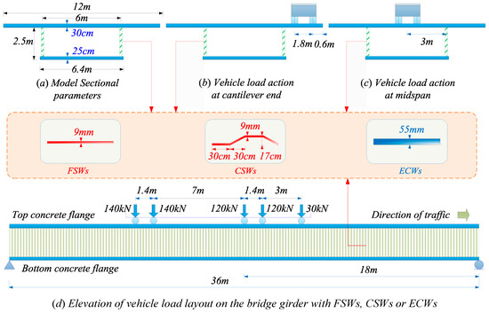 In the following sections, the geometric parameters of the simplified models for the bridge application of box girders with CSWs are given. Considering the different material properties of concrete and steel, the finite element models are established. Combined with different working conditions, the finite element numerical calculations of box girders with CSWs are carried out.