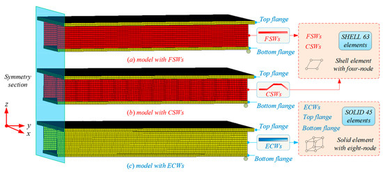 In order to establish the transverse analysis models of the box girders with CSWs, finite element (FE) pre-processing of large finite element general software ANSYS 12.1 [31] has been considered. It is noteworthy that our chosen modelling methodology for the box girders has been rigorously validated through experimental verification in prior studies, ensuring the reliability of the finite element models [32,33,34]. Based on the creation of key points and lines, CSWs are established through vertical drag along an arbitrary vertical line. On the basis of surface creation, the upper and lower concrete slabs are obtained by a similar stretching technique. The three-dimensional (3D), eight-node solid element SOLID 45 was utilised to simulate the top and bottom slabs of box girders with CSWs, while the four-node shell element shell 63 was used to simulate the CSWs, as shown in Figure 4. The concrete slabs have a density set at 2500 kg/m3. In the elastic phase, the finite element model employs linear elastic constitutive relations, incorporating a concrete material elastic modulus of 34.5 GPa and a Poisson ratio of 0.2. The FSWs and CSWs are made of the same type of steel that have a density of 7850 kg/m3. The constitutive relation of the steel material is characterised as a linear elastic state, featuring a steel material elastic modulus of 210 GPa, a Poisson ratio of 0.3, and an acceleration of gravity of 9.8 m/s2. Considering that the models are in an elastic stage throughout, there will be no occurrence of interface relative slip between the concrete flanges and webs. Therefore, these parts are merged into a single instance with the main girder by Boolean operations, ensuring coordinated deformation and reliable connections.