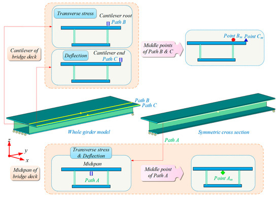 Currently, the unfavourable stress and deflection paths are extracted from ANSYS post-processing results. When the vehicle load is placed on the cantilever of the bridge deck, the transverse stress of Path B (the cantilever root) and the vertical deflection (deflection induced by longitudinal bending of the box girder is not included) of Path C (the cantilever end) are extracted. When the vehicle load is acting on the transverse mid-span of the bridge deck, the transverse tensile stress and vertical deflection of the adverse position (path A) are extracted at the same time. In the same way, the transverse stress and vertical deflection values under gravity action can be obtained. Considering the longitudinal symmetry section of box girders with CSWs, it can be seen that the mid-span path of the girders is Path A. Among them, Am, Bm and Cm are the middle points of paths A, B and C, respectively.