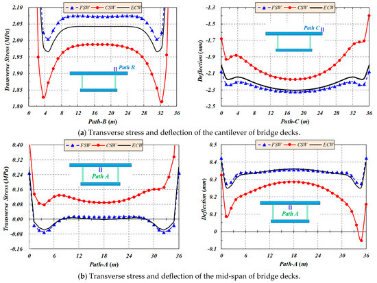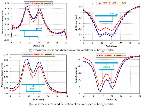 As shown in Figure 6, under vehicle load action, the transverse tensile stress and deflection at the cantilever end and the mid-span of the box girders with CSWs are lower than those of the box girders with FSWs and the box girders with ECWs. Among them, the transverse stress and deflection values are similar at the cantilever end and mid-span of box girders with FSWs and with ECWs.