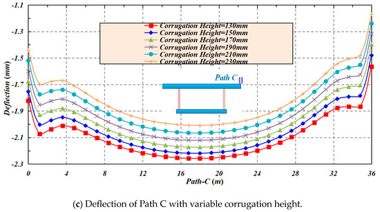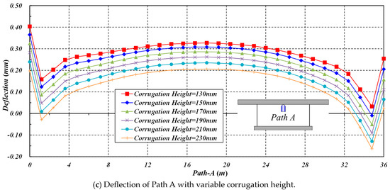 With the increase in corrugation height of the box girders with CSWs, the transverse stress of Path A increases, while the corresponding deflection decreases. When the corrugation height increases from 130 mm to 230 mm (with an increment of 20 mm), the transverse peak stress of Point Am increases from 0.04174 to 0.18728 MPa, accompanied by a growth of 0.14554 Mpa, and the corresponding deflection decreases from 0.327 to 0.206 mm, with a drop of 0.121 mm, as shown in Figure 14.