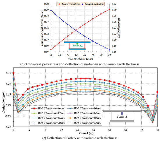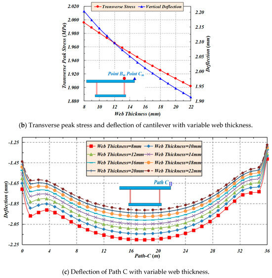 When the thickness of webs increases, the transverse stress of Path B and the deflection of Path C decrease. When the thickness of the webs increases from 8 mm to 22 mm (with an increment of 2 mm), the transverse peak stress of Point Bm drops from 1.996 MPa to 1.902 Mpa, accompanied by a drop ratio of 4.71%, and peak deflection of Point Cm decreases from 2.203 mm to 1.9128 mm, with a drop ratio of 13.17%, as shown in Figure 9.