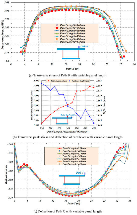 With the increase in the panel segment length (length of longitudinal panel or projected length of inclined panel in relation to longitudinal axis) of the CSWs, the transverse stress of Path B increases, while the deflection of Path C decreases. Here, under the premise that the total length of box girders with CSWs is constant, the numbers of different panel segments of box girders with CSWs should be converted according to the variation in panel segment lengths. When the length of the longitudinal panel and projected length of the inclined panel in relation to the longitudinal axis (these two lengths are equal here) increase from 250 mm to 430 mm (with an increment of 30 mm), the transverse peak stress of Point Bm tends to increase from 1.9828 to 1.9972 MPa, accompanied by a growth rate of 0.73%, and the peak deflection of Point Cm tends to decrease from 2.182 to 2.142 mm, with a drop ratio of 1.83%, as shown in Figure 10.