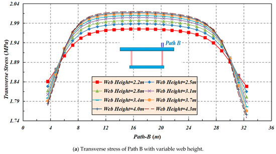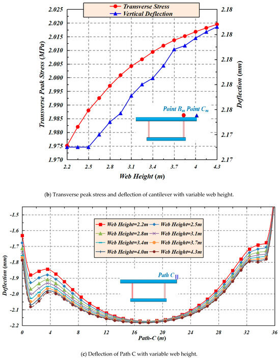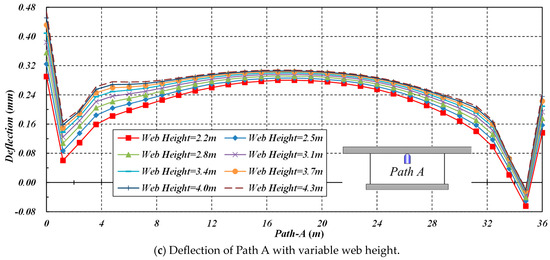 As the height of webs increases, the transverse stress of Path A decreases, while the corresponding deflection increases. When the web heights increase from 2.2 m to 4.3 m (with an increment of 0.3 m), the transverse peak stress of Point Am decreases from 0.11441 to 0.02035 MPa, accompanied by a drop of 0.09406 Mpa, and the corresponding deflection increases from 0.28 to 0.3076 mm with a growth of 0.0276 mm, as shown in Figure 17.
