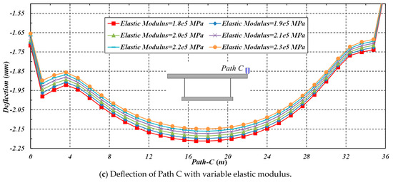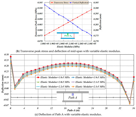 When the modulus of elasticity of CSWs increases, the transverse stress of Path A increases, while the corresponding deflection decreases. When the modulus of elasticity of webs increases from 1.8 × 105 MPa to 2.3 × 105 Mpa (with an increment of 0.1 × 105 Mpa), the transverse peak stress of Point Am increases from 0.0751 to 0.09864 Mpa, accompanied by a growth of 0.02354 Mpa, and the corresponding deflection decreases from 0.303 to 0.275 mm, with a drop of 0.028 mm, as shown in Figure 18.