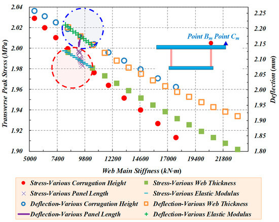 As the stiffness of webs increases, the transverse stress of Path B and the deflection of Path C decrease. When the transverse peak stress of Point Bm decreases, the peak deflection of Point Cm decreases. It could also be observed that the rigidity of the panel segment has little effect on the improvement of the overall stiffness, while it is more sensitive to the transverse stress and deflection, as shown in Figure 13.