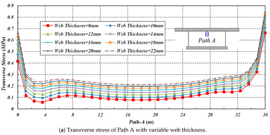 With the increase in the web thickness, the transverse stress of Path A increases, while the corresponding deflection decreases. When the web thickness increases from 8 mm to 22 mm (with an increment of 2 mm), the transverse peak stress of Point Am increases from 0.07806 to 0.21174 MPa, accompanied by a growth of 0.13368 Mpa, and the corresponding deflection decreases from 0.299 to 0.1672 mm, with a drop of 0.1318 mm, as shown in Figure 15.