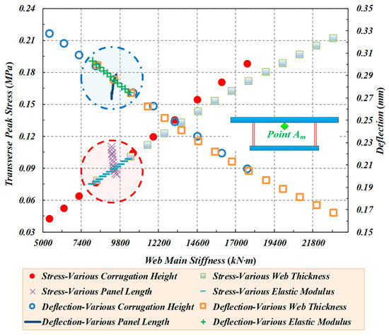 As the stiffness of the webs increases, the transverse stress of Path A increases, while the corresponding deflection decreases. When the transverse peak stress of Point Am increases, the corresponding peak deflection decreases. The rigidity of the panel segment has little effect on the improvement of the overall stiffness, as shown in Figure 19.