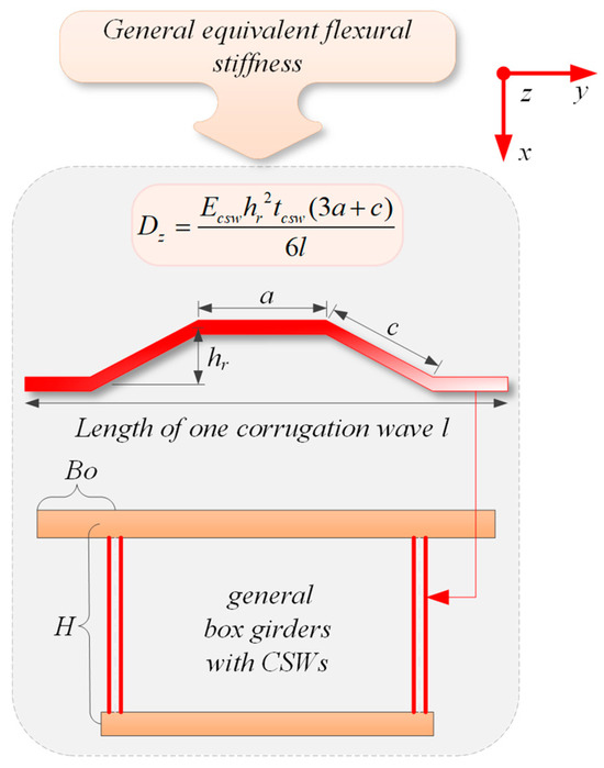 The equivalent flexural stiffness of the CSWs in x-direction per unit length for box girder bridges, involving many corrugation waves with the dimensions shown in Figure 20, can be calculated as: