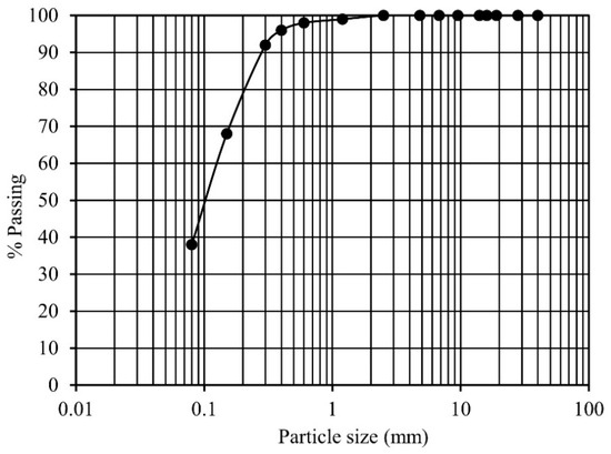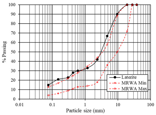 The aggregate used in the road base material of this study was laterite, which is a common road base course material used in Western Australia. The initial assessment of the laterite aggregate included performing the particle size distribution and Atterberg limits tests to determine its suitability for chemical stabilisation. The particle size distribution was carried out following Main Road Western Australia MRWA [15] with the grading checked against the base course quality limits. The liquid limit (LL) was conducted following the Australian Standard AS1289.3.9.1 [16], whereas the plastic limit (PL) was conducted following the Australian Standard AS1289.3.2.1 [17]. The particle size distribution of the laterite aggregate used in this study is illustrated in Figure 1, and Atterberg’s gradation is presented in Table 1. It is evident from Figure 1 that the sample did not meet the MRWA 501E specification in terms of particle size distribution, indicating that it needed some form of stabilisation; aggregate materials that fail to meet the specified gradation requirements must be stabilised to ensure they possess the necessary performance properties to be utilised as a pavement layer without premature failure. The Atterberg limits results presented in Table 1 categorize the fines as low plasticity silt according to the unified soil classification system.