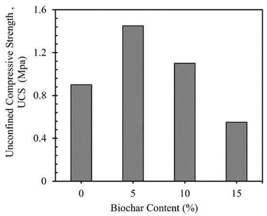 Despite the observed substantial increase in strength for the material treated with 5% biochar, there was a noteworthy decrease in strength with 10% and 15% biochar content, as depicted in Figure 3. This can be attributed to the distinct physical properties of biochar and aggregate. While aggregate is a dense composition of varying sizes of stone or rock with inherent load-bearing capabilities, biochar is a low-density, highly porous material that in its pure form does not exhibit significant strength capacity. Consequently, the composition of the blended material comprising aggregate and 10–15% biochar was disproportionately leaning towards the nonstructurally sound material, resulting in a decline in strength in terms of performance requirements when compared to the blend treated with 5% biochar.