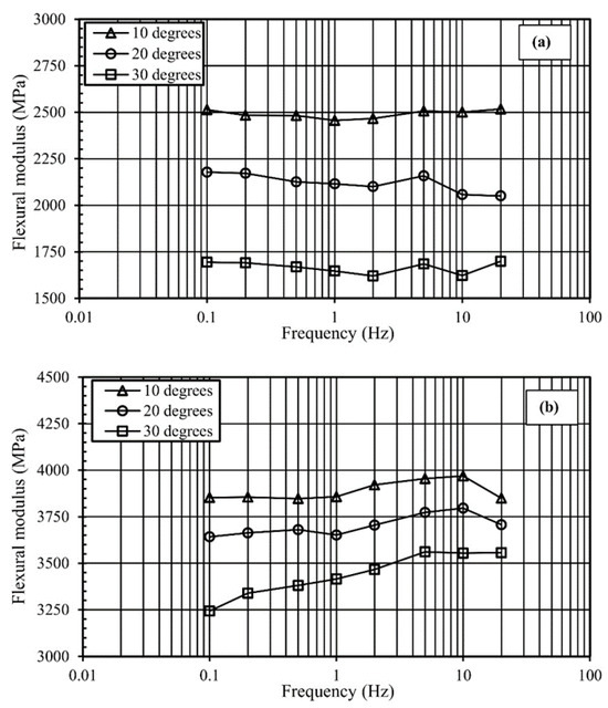 Flexural modulus for emulsion–biochar-treated samples tested under diverse temperatures (10, 20, and 30 °C) and frequencies ranging from 0.1 to 20 Hz: (a) 3% biochar and 4.8% emulsion (b) 5% biochar and 8% emulsion.