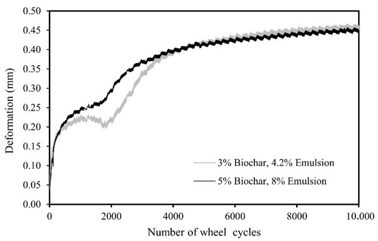 Response of deflection versus number of wheel cycles for samples treated with a 1:1.6 biochar-to-emulsion ratio at two stabiliser levels: 3% biochar with 4.8% emulsion and 5% biochar with 8% emulsion.
