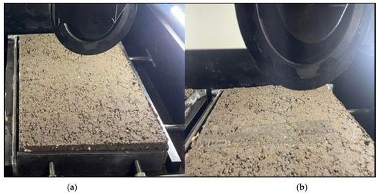 Visual inspection of emulsion-biochar stabilised slabs undergoing wheel tracking: (a) pre-testing and (b) post-testing.