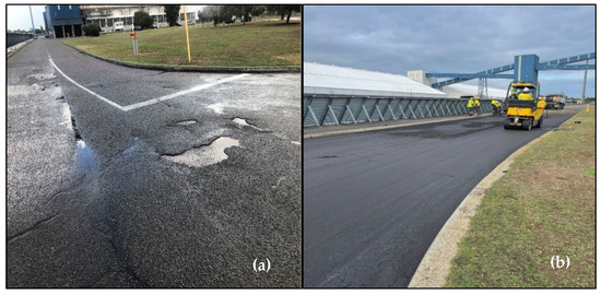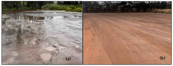 Laboratory testing was conducted on cores extracted from the pavement after eight weeks’ postconstruction. The resilient modulus of the extracted cores was determined through ITM laboratory testing, and the results showed an average resilient modulus of 3210–3800 MPa. The Austroads (2017) design guide [20] outlines an acceptable modulus range of 2000–6000 MPa, with a typical value of 3500 MPa, confirming that the structural performance of the pavement was adequate. Figure 8 shows the condition of the road pre- and postrehabilitation of this field trial.