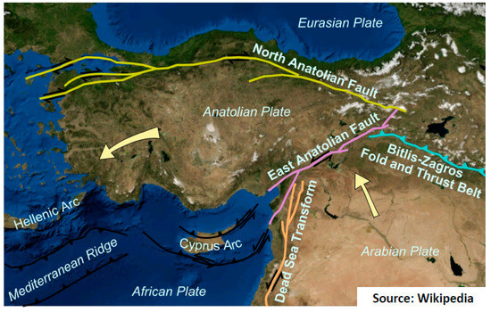 Türkiye is located in a seismically active zone of convergence between the Arabian, African, and Eurasian plates. Approaching the African and Arabian tectonic plates to the Eurasian plate causes high seismic activity in this region. Figure 1 shows the main tectonic structures around the Anatolian Plate. Here, the arrows show the displacement vectors of the Anatolian and Arabian plates relative to the Eurasian plate [1]. The westward motion of the Anatolian plate is accommodated by the North and East Anatolian faults. The North and East Anatolian faults connect at Karlıova in Eastern Anatolia and make the Karlıova triple junction. The North Anatolian Fault (NAF) is an almost east–west (E–W) trending right-lateral strike-slip fault for a length of about 1200 km and forms the transform boundary between Eurasia and Anatolian plates. The East Anatolian Fault (EAF) is a northwest–southeast (NW–SE) trending left-lateral strike-slip fault for a length of about 550 km long [2], and starts from Hatay and continues through Kahramanmaraş, Adıyaman, Malatya, and Elazığ provinces until Bingöl. The EAF is divided into three main sections with several subsegments: (i) the main (southern) branch, (ii) the northern strand (Sürgü–Misis fault), and (iii) the Karasu trough. The southern (main) strand includes the Karlıova, Ilıca, Palu, Pütürge, Erkenek, Pazarcık, and Amanos segments. Another major fault line is the West Anatolian Fault (WAF), which is an earthquake area in the west of Anatolia extending from east to west and consisting of many faults lined up from north to south. The NAF, EAF, and WAF are responsible for several significant earthquakes which caused loss of life and property. The earthquake risk of Türkiye is further compounded by the presence of major cities with high population densities located in seismically active areas. The Earthquake Hazard Map of Türkiye given in Figure 2 clearly shows that a significant part of the population and building stock of the country is at risk of earthquakes and that measures should be taken. The arrows in the figure represent terrestrial mass movements.