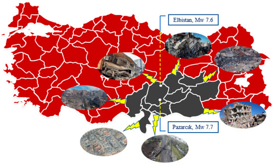 The earthquakes were felt in a wide area covering Southeastern Anatolia, Eastern Anatolia, Central Anatolia, and Mediterranean regions (Figure 5). A great destruction/collapse occurred in eleven provinces located in southern Türkiye, and thousands of buildings collapsed. Figure 6 illustrates the extent of destruction in some of the cities most affected by these earthquakes.