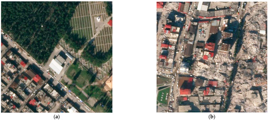 The images used in the study were obtained from the sources provided by the Maxar and Planet companies. Details about the image properties are given in Table 2. An example of the images used (satellite image provided by Planet) is given in Figure 8. The image covers a very large part of the city center of Hatay and includes buildings with different damage levels. This study aims to find only collapsed structures and other types of damage are not considered. To do this, only collapsed buildings are masked in the images. The success of training in DL is directly proportional to the number of images used and the correct and/or clear display of the object to be detected in the image. Therefore, orthophoto images were converted to 512 × 512 images to increase the number of images to be used in the analysis and to make clearer masking. The 27,824 pieces of data obtained were examined one by one and the images without collapsed buildings were eliminated.