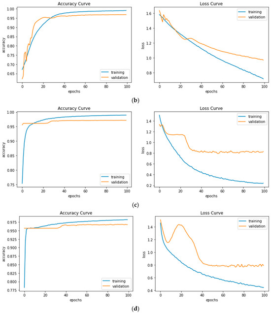The proposed method is implemented within Jupyter notebooks. The experiments are conducted on a desktop with an Intel(R) i7-7700 3.6 GHz CPU and a GPU of Nvidia GeForce GTX 1070Ti with 8GB memory. The networks are trained with Adam optimizer with a learning rate and momentum depth hyperparameters set to 1 × 10−5 and 0.90, respectively. The batch size is chosen as 8 and the training process is limited to 100 epochs for the proposed models. The segmentation models are trained on the resized image of the original image size, 512 × 512 for U-net, LinkNet, 256 × 256 for FPN, and 384 × 384 for PSPNet. The possible choices of training parameters to be used were optimization algorithm, epoch, batch size, weight initialization, and learning rate. Based on the Keras framework, segmentation model libraries were used to perform the experiments in this study.