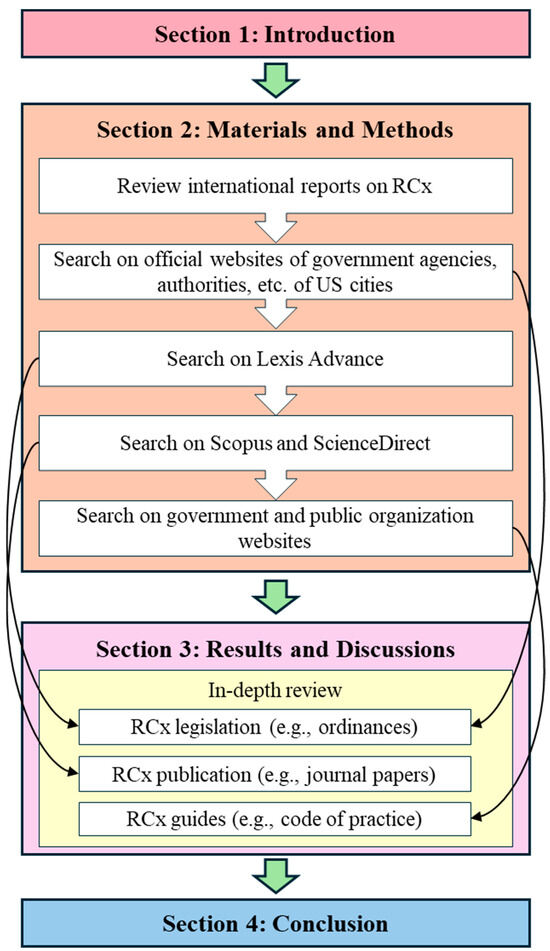 Figure 1 illustrates the steps taken in this study and the corresponding sections of this paper. At the beginning, searches were conducted to identify any laws (e.g., ordinances and regulations) on or related to RCx in China and the US. Given that New York and San Francisco are US cities with mandatory RCx requirements imposed [36] and with reference to the comparison of US RCx policies made by the Institute for Market Transformation [37], a further search was undertaken to identify any statutory RCx requirements enacted in other US cities including Seattle, Los Angeles, and Philadelphia. For these search processes, the official websites of the government agencies, authorities, etc., of the above places were inspected and Lexis Advance, which is a legal research search engine that hosts an extensive content source and incorporates the latest legislation, was also used.