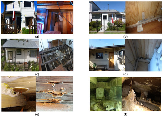 In 2004 onward in Chile, the Universidad Austral de Chile identified the first appearance of the Serpula lacrymans fungus in some dwellings in Temuco and Puerto Montt [42]. In 2018, the Housing and Urban Planning Service (SERVIU) in Los Ríos Region identified isolated cases of dwellings affected. There were also some isolated cases in Concepción, in the Biobío Region. Between 2019 and 2020, the Ministry of Housing and Urbanism of Chile (MINVU) recorded 17 cases of dwellings affected to a lesser or greater extent by this fungus in the city of Valdivia: 1 in Paillaco, 1 in the Union, 12 in Temuco, and 3 in Padre Las Casas, thus affecting the populations of Teniente Merino in Valdivia and of both Millaray and Las Quilas in Temuco, as well as others in various areas of these and other regions [43]. The problems were mainly found in ventilated floors and in the joints between walls and floors, consistent with the advance of the mycelial growth from the natural ground [44]. Figure 1 shows the damage and progress of the fungus under the floor, on the floor and in the walls of four dwellings in the city of Valdivia.