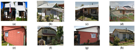 Pictures from (a–d) correspond to the dwellings in Temuco, and pictures from (e–h) correspond to the dwellings in Valdivia. Dwellings (d,g) correspond to witness dwellings, with no damage.