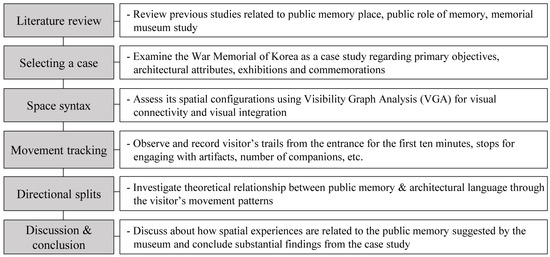 To explain the relationship between architecture and public memory, we conducted a literature review encompassing the different symbolisms of public memory sites, memorial museum studies by memory scholars, and architectural attributes in the space syntax community. We selected the War Memorial of Korea as the case study, the historical background and important criteria of which have been described, and examined the primary functions and aims for erecting this architectural design. The following analysis will demonstrate how this design works from both commemorative and configurational viewpoints using the space syntax technique; it will also use movement-tracking data to identify the way architectural language affects the spatial experience of the visitor. This study concludes with a consideration of the substantial roles architectural language plays in embodying public memory as a memorial place, preserving and exhibiting material remains in a museum.