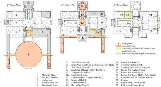 We need to determine whether a single case study is sufficient for exploring how public memory is represented or perceived. The reason for conducting a case study was that identifying appropriate cases in Korea is difficult. Of course, there are several memorial museums and spaces, but most of them are focused on particular people who dedicated their lives to the liberation and independence of the country, or specific subjects such as the Korean War abductees or the peasant revolution. This is why their floor area is relatively small; therefore, the whole spatial structure is easy to understand at once. They also focus on narrating events rather than collecting and preserving materials and remains. In contrast, the WMoK is sufficiently large to secure and exhibit artifacts and remains about all the wars that took place in Korea (i.e., the original role of the museum), serving as a storytelling building and a healing place for the present and future generations (i.e., for commemorating sacrifices and losses). Therefore, the WMoK, which acts as a comprehensive museum, is a suitable case for this study.