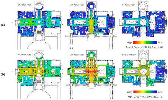 Figure 7 depicts the syntactical results at two different scales. In the visual connectivity at a local scale, we can recognize there is a strong pattern in terms of spatial connectedness. That is, the main hall and memory halls colored in red and yellow have a higher number of direct connections; in particular, the main hall is the most connected space in this connectivity analysis. Similarly, the gathering spaces on other floors (e.g., the Central Hall, Inner Plaza, Large Military Equipment Exhibition on the first floor, and corridors along the voids on the third floor) are relatively well connected. In contrast, there are fewer exhibition spaces across the building. From this, we can understand that gathering spaces, such as the Main Hall, Inner plaza, and corridors, locally construct a number of viewpoints that offer an opportunity for social interactions on account of their greater total number of direct connections to other spaces. In particular, direct connections are formed in distinctive ways. On the first floor, the three large spaces of the Inner Plaza, the Lower Central Hall, and the exhibition of Large Military Equipment are well connected, so that it is hard to escape the longitudinal axis along the east–west direction. However, on the second floor, the main hall and memory halls (the most commemorative experience in this building) are closely articulated so that there is a strong visual connection from the front to the deepest space of the building. Hence, it can be said that visual connectivity works distinctively: it constructs the commemorative sequence of spaces with adding depths, and conversely, it constitutes the spectacular sequence of spaces with the compressed representation of war.