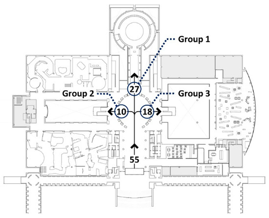 Figure 9 show the results of the directional splits: a total of 27 subjects took the straight forward direction from the entry point, these visitors were categorized as “Group 1”; 10 subjects made a left turn, these visitors were labeled as “Group 2”; the rest (18 out of 55) headed to the right side of the building, these visitors were labeled as “Group 3”. Approximately half of the subjects (27 out of 55) selected the cross-sectional direction (i.e., the north–south axis), whereas the rest (28 out of 55) selected the longitudinal direction on both sides of the building (i.e., the east–west axis).