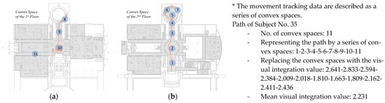 Figure 11, for instance, the trail taken by the subject no. 35 is described as a series of convex spaces like 1-2-3-4-5-6-7-8-9-10-11. These convex spaces can be represented by a string of the mean visual integration values such as 2.641-2.833-2.594-2.384-2.009-2.018-1.810-1.663-1.809-2.162-2.411-2.436, or by the mean number of these values like 2.231. Therefore, the trail performed by the subject no.35 is explained by the unique syntactical attribute value of 2.231.