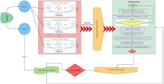 42]. RF was chosen for its ability to handle complex, non-linear relationships in the data and provide a robust performance. Its ensemble nature helps mitigate overfitting and enhances generalization on diverse datasets. Notably, GWO was selected for optimization tasks due to its inspiration from the social behavior of gray wolves, offering a balance between exploration and exploitation. Its adaptability makes it suitable for various optimization problems, including those encountered in our research. Furthermore, XGBoost was included for its strong performance in handling structured/tabular data and its efficiency in boosting weak learners. Its capability to model complex relationships and feature interactions makes it well suited for predictive modeling tasks. Hence, the combination of these algorithms was intended to leverage their individual strengths and address different aspects of the problem at hand. RF provides robustness, GWO aids in optimizing parameters, and XGBoost enhances predictive accuracy. Traditional methods often fail to capture the intricate relationships between various input parameters and the resulting mechanical properties. The Ensemble approach, combining random forest (RF), gray wolf optimizer (GWO), and XGBoost algorithms, offers a sophisticated solution by harnessing the strengths of each constituent algorithm, thereby presenting a robust and innovative predictive model [