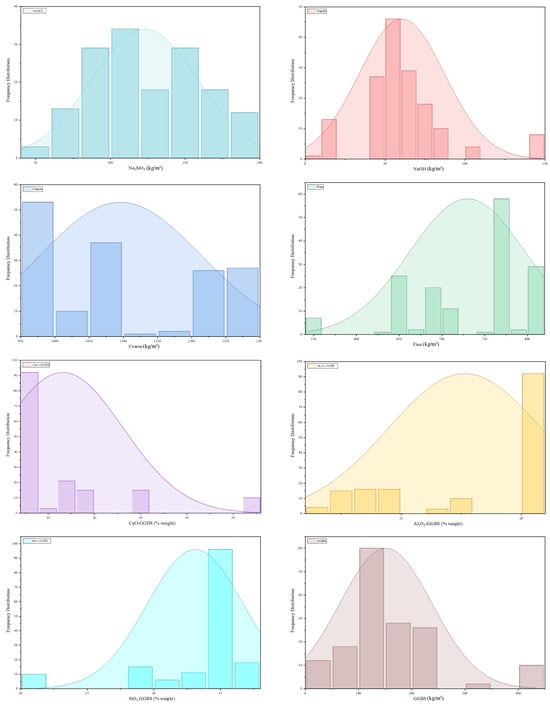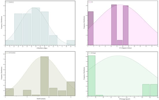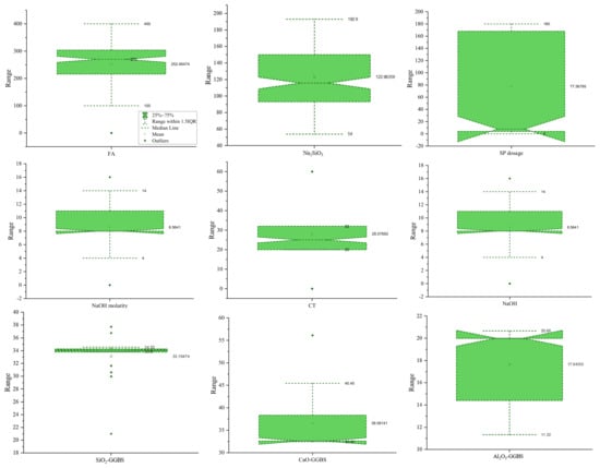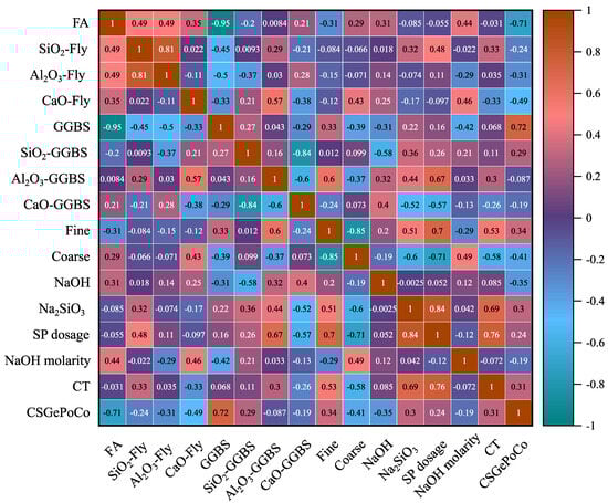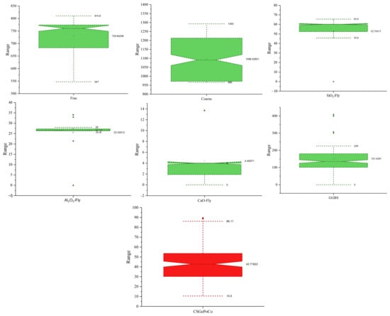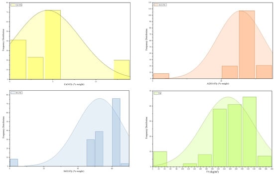 Table 4 presents the summary of the descriptive statistics, including the average, standard deviation, minimum, and maximum. It is noteworthy that the variables incorporated in developing the models exert a significant effect on the robustness of the models. It is acknowledged that the reactivity of raw materials, such as fly ash, can exhibit significant variations depending on their geographical origin and processing conditions. This inherent variability is attributed to differences in mineralogical composition, particle size distribution, and the presence of impurities.
