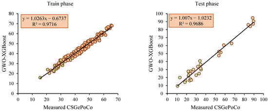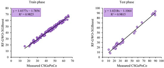 Figure 15 illustrate the correlation of the CSGePoCo value (actual versus estimated) for the RF–GWO–XGBoost model, demonstrating its superiority over the RF, XGBoost, and GWO–XGBoost models, particularly on the training dataset. Notably, the optimization models (GWO–XGBoost and RF–GWO–XGBoost) exhibit significantly improved correlation, with the proposed hybrid RF–GWO–XGBoost model performing exceptionally well. In the testing phase, the regression levels of the optimization models surpass those of other models, with the proposed RF–GWO–XGBoost model standing out.