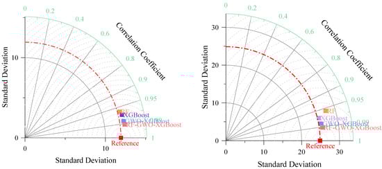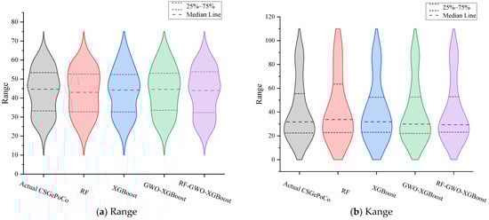 Figure 17 reveals that the violin plots exhibit a close mean value of predicted CSGePoCo by the proposed RF–GWO–XGBoost model to measured CSGePoCo. Moreover, the Taylor diagram demonstrates that the proposed RF–GWO–XGBoost model excels in predicting CSGePoCo, closely aligning with the actual values.