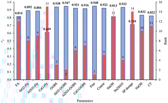The importance of the parameters in the proposed RF–GWO–XGBoost model can be presented as CaO-Fly < SP dosage < NaOH < FA < CT < NaOH < Al