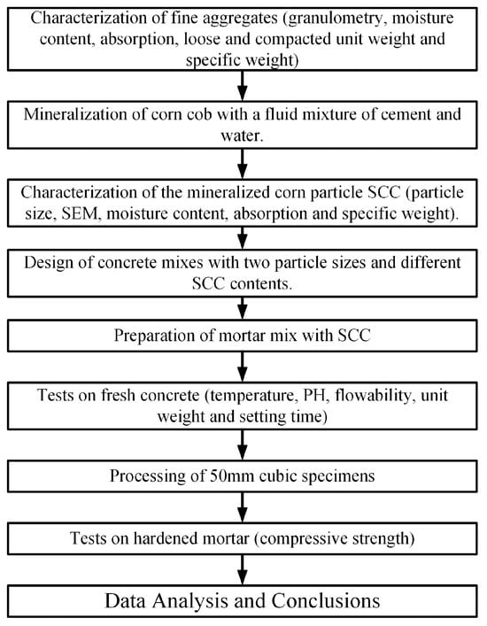 According to the flow diagram presented in Figure 1, first the properties of the natural sand were determined: fineness modulus, moisture, absorption, and specific weight. The crushed corn cob was mineralized and its characteristics were described with a mixture of cement and water in order to be used as a replacement for sand in the mix, and was designed using two different granulometries of SCC and water–cement ratio of 0.5. In addition, the internal structure and chemical composition of the corn particles were studied using Scanning Electron Microscopy (SEM). The mix designs were made based on the ACI 211 limit based on the two required particle sizes. Finally, a series of tests were performed on both fresh and hardened concrete specimens to investigate the physical and mechanical properties of the mortar with different contents and particle sizes of mineralized corn cob.