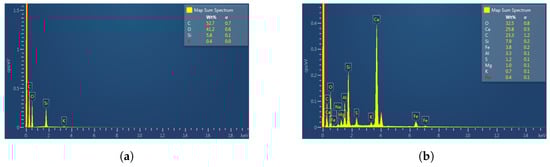 The X-ray diffractogram in Figure 6 reveals the chemical composition in weight percentages of the SCC: 32.5% oxygen (O), 25.8% calcium (Ca), 23.3% carbon (C), 7.9% silica (Si), 3.8% iron (Fe), and 3.3% aluminum (Al), i.e., the sample is most likely composed of some mineralogical series of aluminates, silicates, and oxides. In addition, Pinto [] reported very similar values for the chemical composition of the SCC.