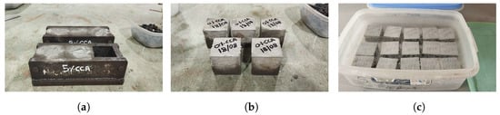 The mortar mixture is prepared according to ASTM C305 [], using a 4-liter container mixer. In the mortar-mixing process, the SCC particles were incorporated simultaneously with the fine aggregate. Subsequently, cubic specimens of mortar 50 mm on each side were molded according to ASTM C109 []. For each design, 12 cubes were molded, making a total of 96 samples. The specimens were left inside the molds for 24 h, after which they were removed and cured in alkaline water (3 g of lime per liter) for proper hydration for 3, 7, 14, and 28 days as shown in Figure 7.