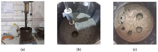 The setting time for the SCC-G2-10% mortar. (a) Penetrometer. (b) Needle penetration into the mortar. (c) Tested sample.